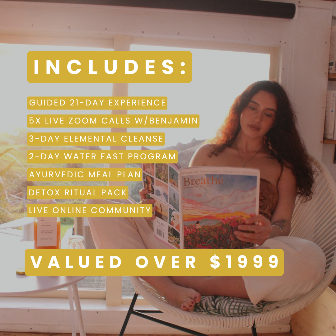 - 2-day water fast → Following the elemental cleanse you will be gudided through a 2-day water fast for a complete body, mind, spirit reset.